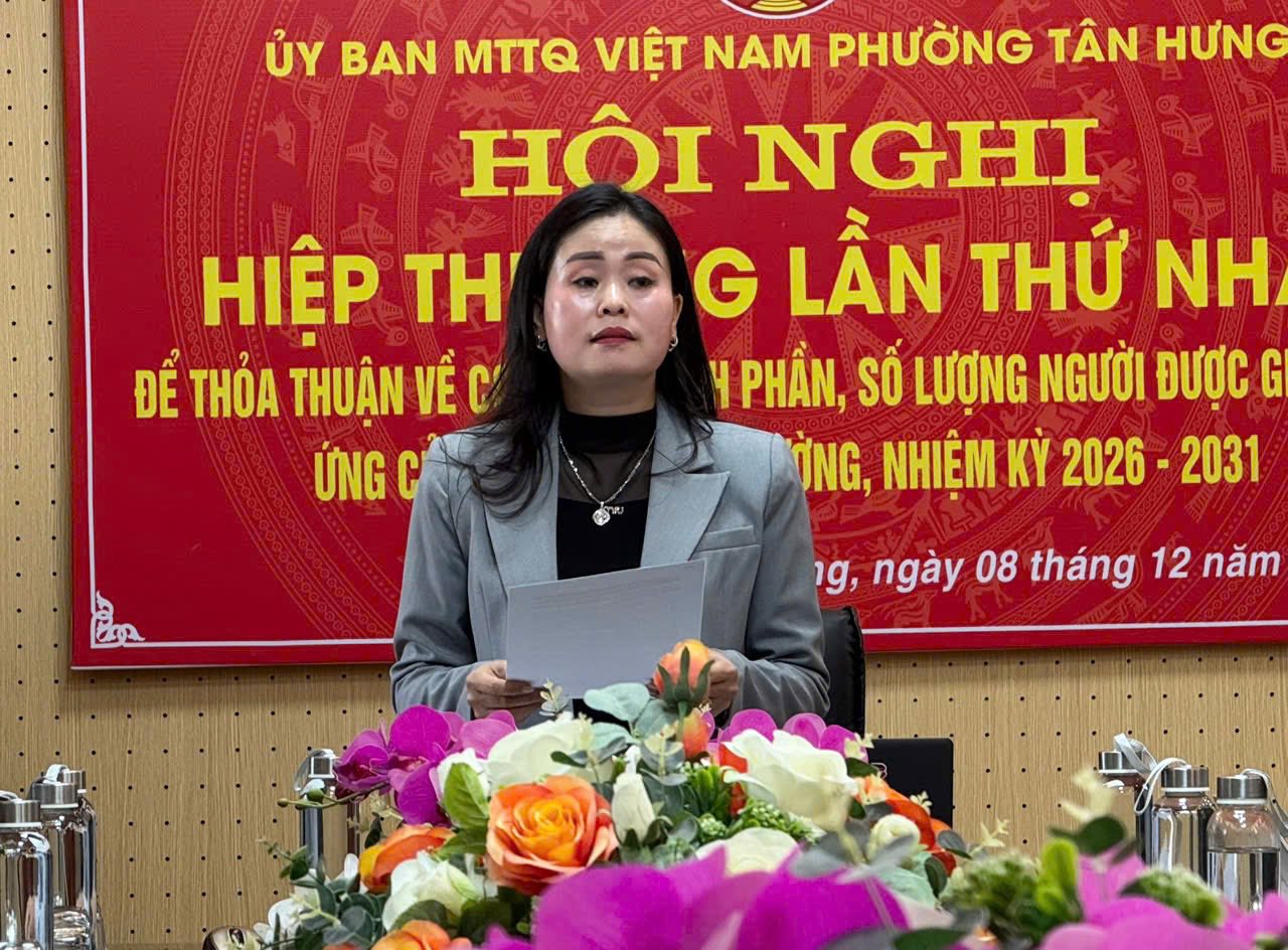 Sáng 8/12, Ban Thường trực Ủy ban MTTQ Việt Nam phường tổ chức Hội nghị hiệp thương lần thứ nhất để thỏa thuận về cơ cấu, thành phần và số lượng những người ứng cử đại biểu HĐND phường Tân Hưng, nhiệm kỳ 2026-2031.