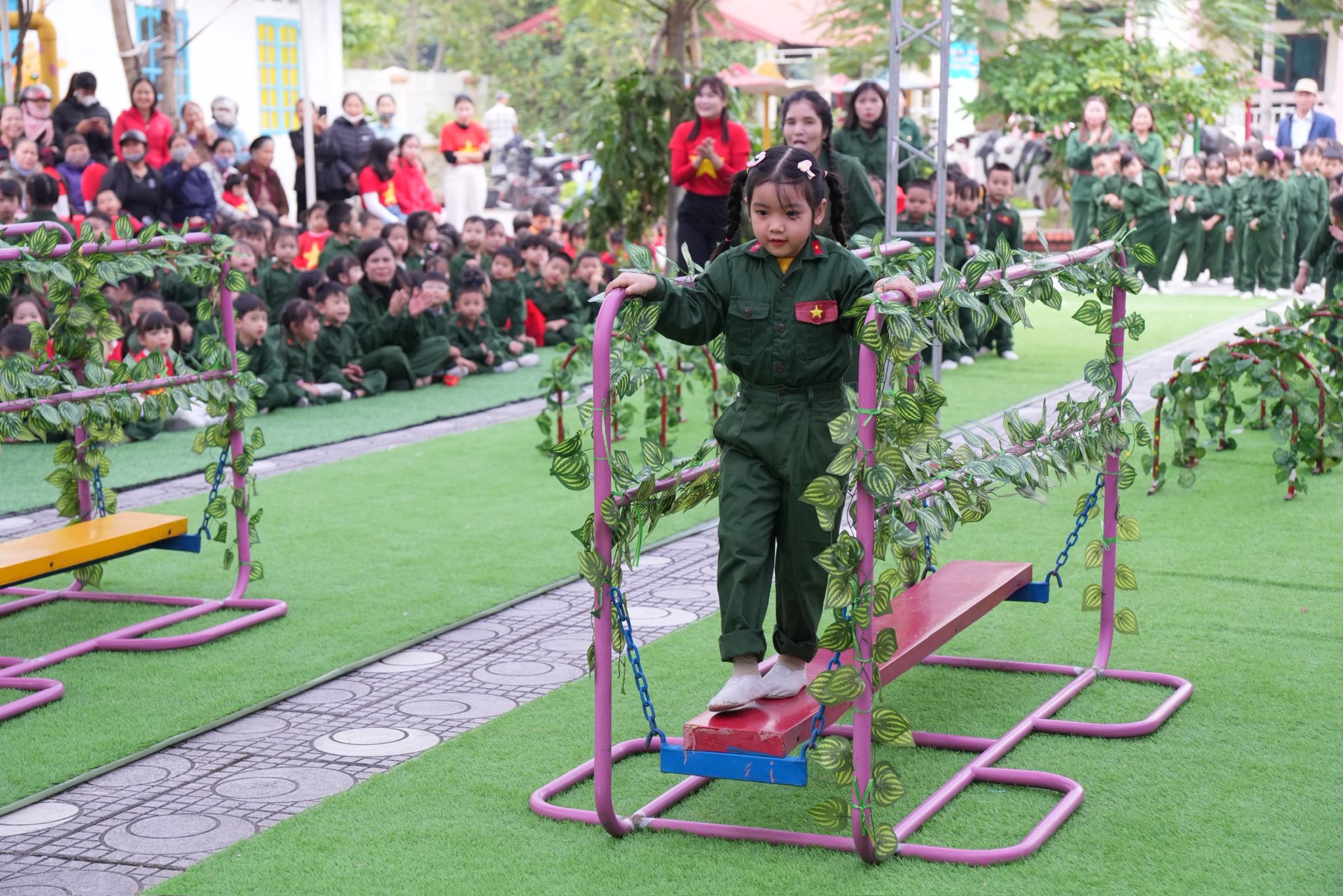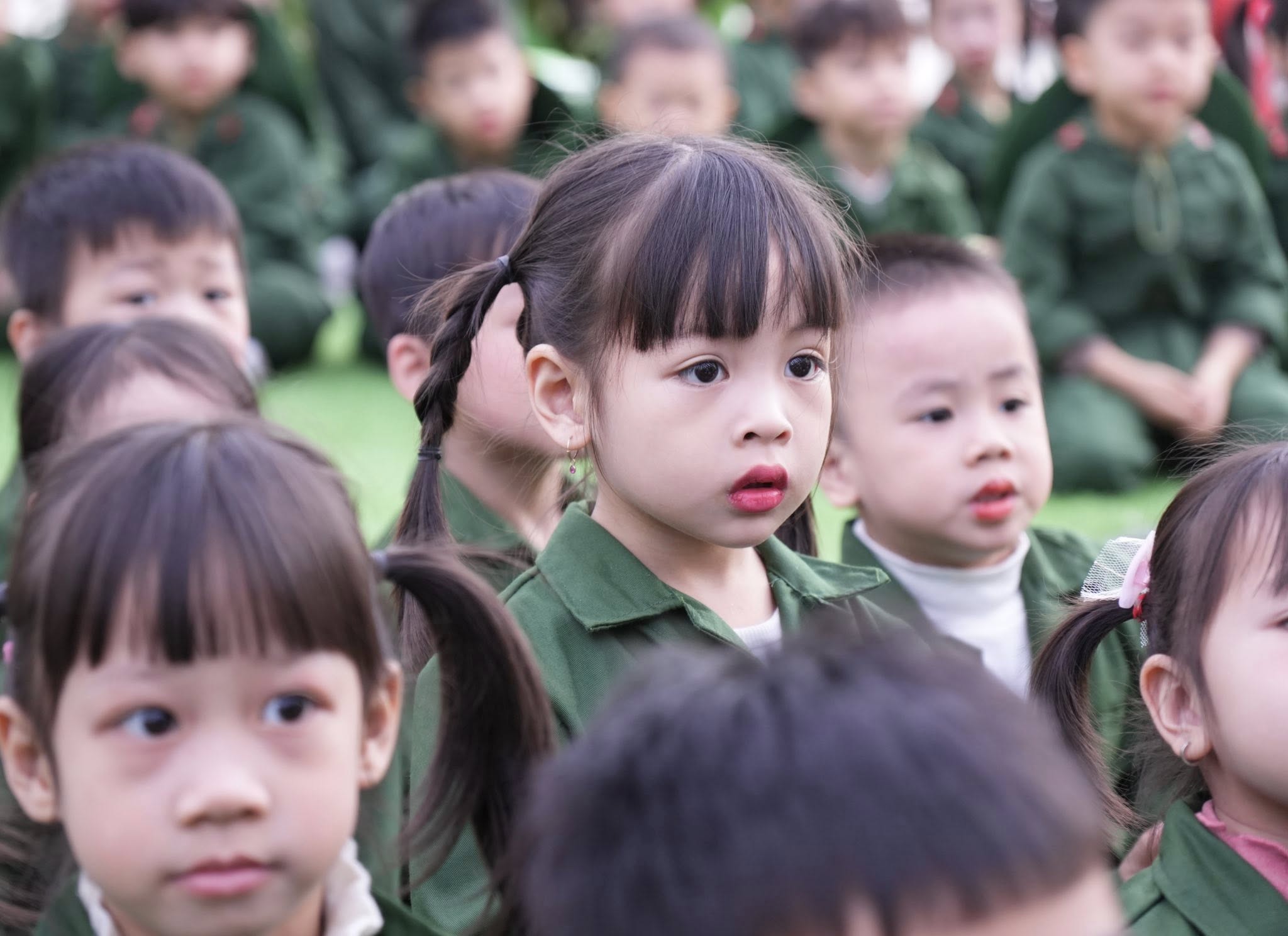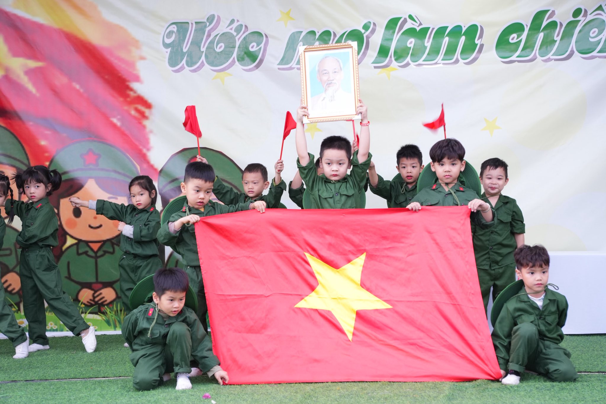 Mở đầu chương trình là màn diễu hành sôi nổi, đáng yêu của các bé đến từ các khối lớp với tên gọi các đơn vị như: Tiểu đội Đặc công 5C, Bộ đội Biên phòng 5B, Lực lượng Công binh 5A… Tiếp đó, các em được ôn lại truyền thống lịch sử vẻ vang của Quân đội Nhân dân Việt Nam, lắng nghe đồng chí Nguyễn Hữu Chương – Chủ tịch Hội Cựu chiến binh phường kể lại những năm tháng chiến đấu hào hùng, qua đó giúp hình ảnh chú bộ đội không chỉ hiện diện trong tranh ảnh mà trở nên gần gũi, thân thương ngay tại sân trường.