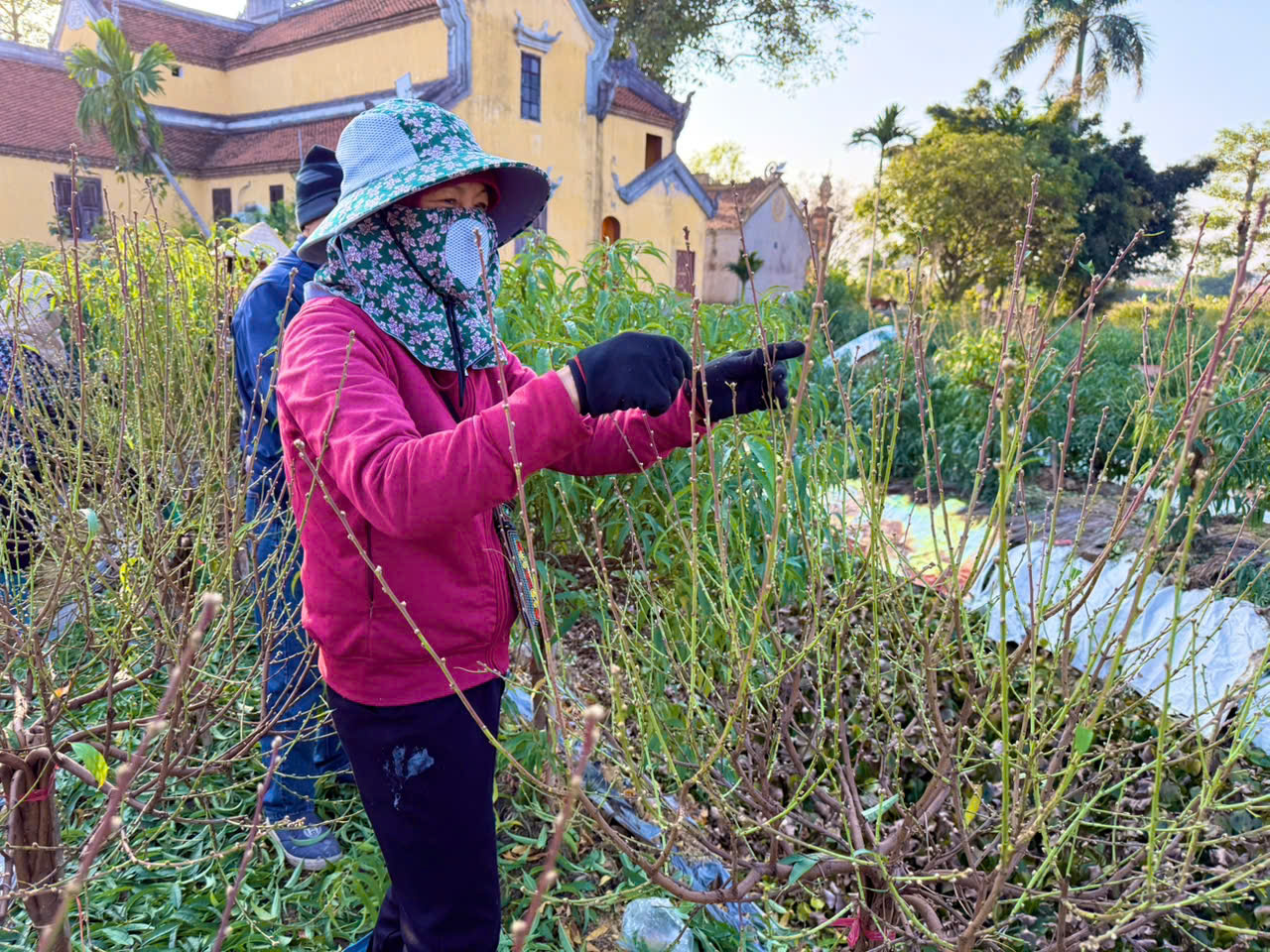 Người trồng đào đang tất bật tuốt lá căn thời điểm nở đúng dịp Tết