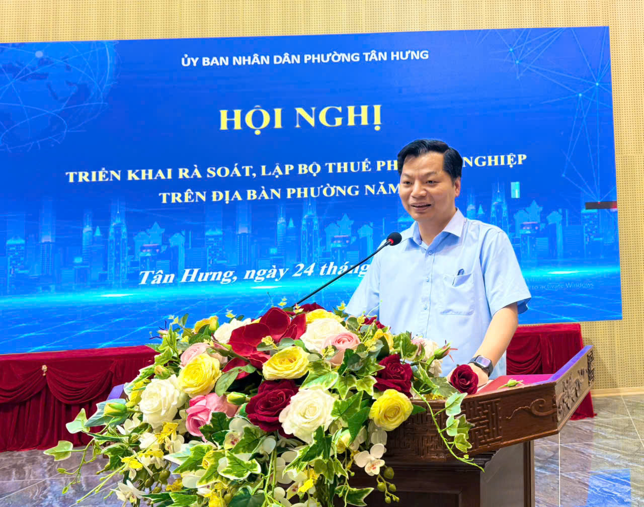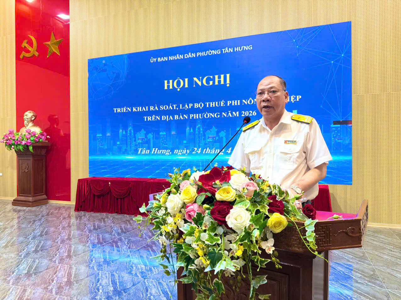 Chiều 24/4, UBND phường Tân Hưng tổ chức Hội nghị triển khai công tác rà soát và lập bộ thuế sử dụng đất phi nông nghiệp năm 2026 trên địa bàn phường. Mục tiêu là đảm bảo công tác lập bộ thuế được thực hiện chính xác, đầy đủ, đạt hiệu quả cao, góp phần tăng cường quản lý thu ngân sách nhà nước trên địa bàn.