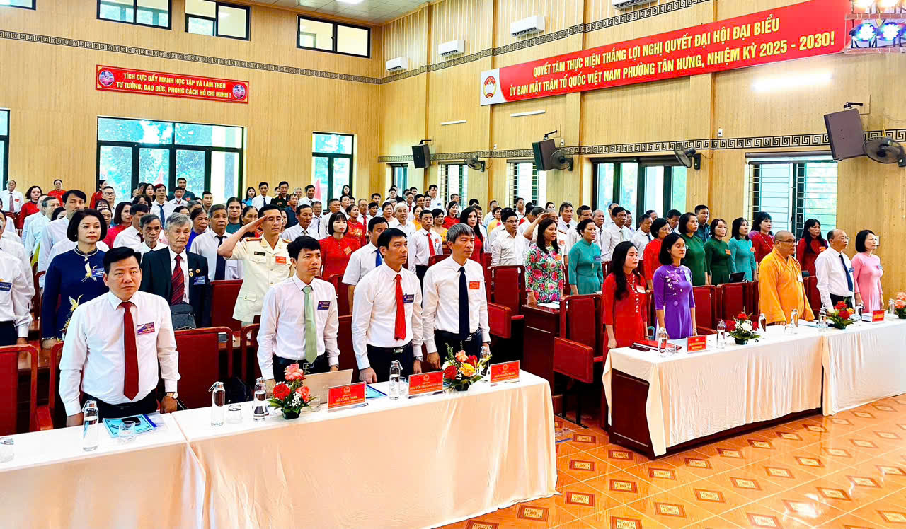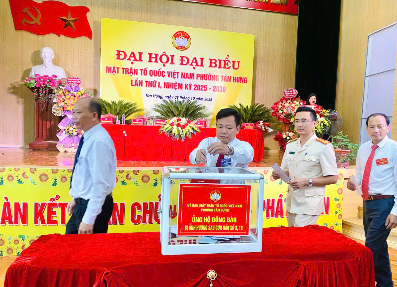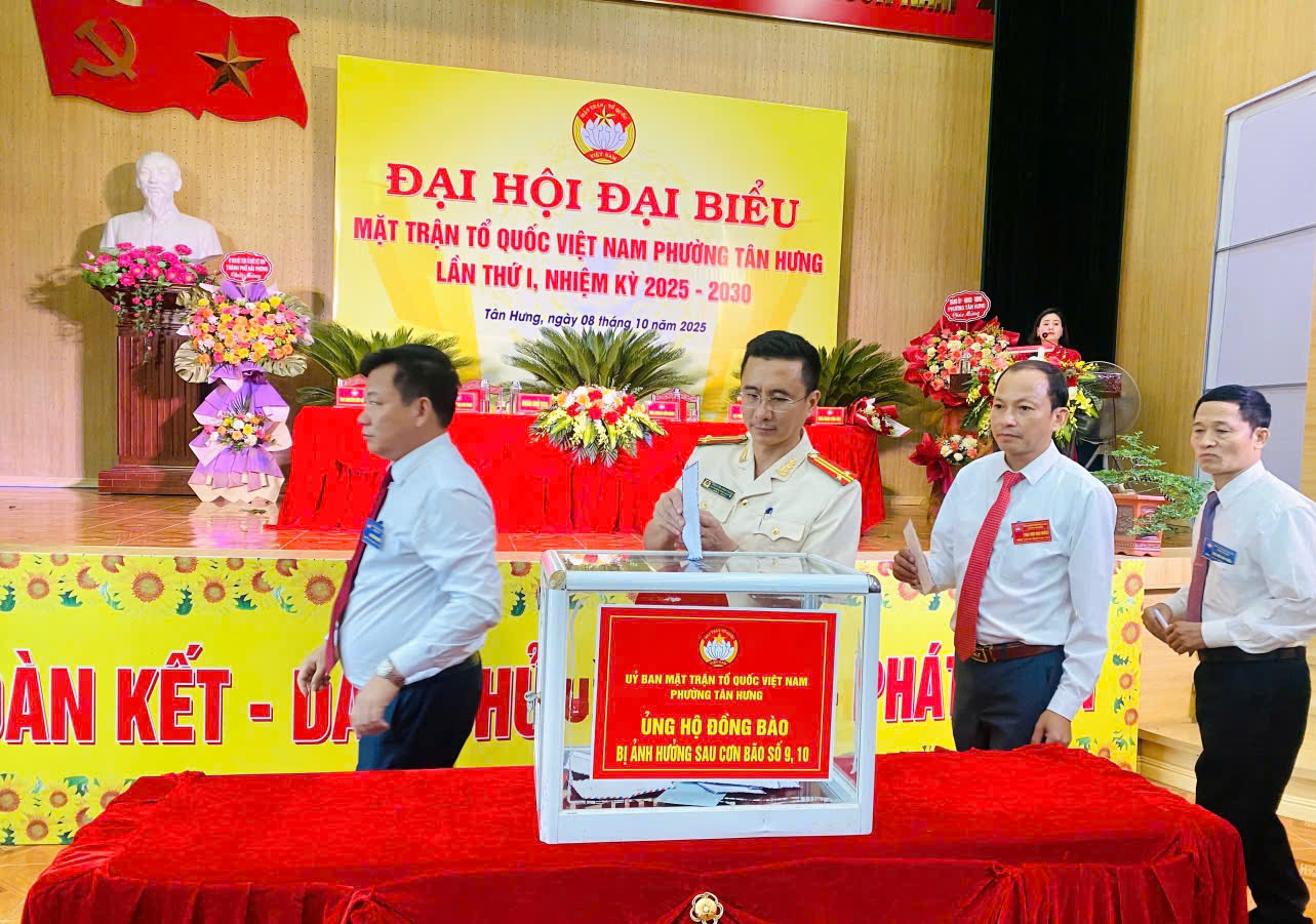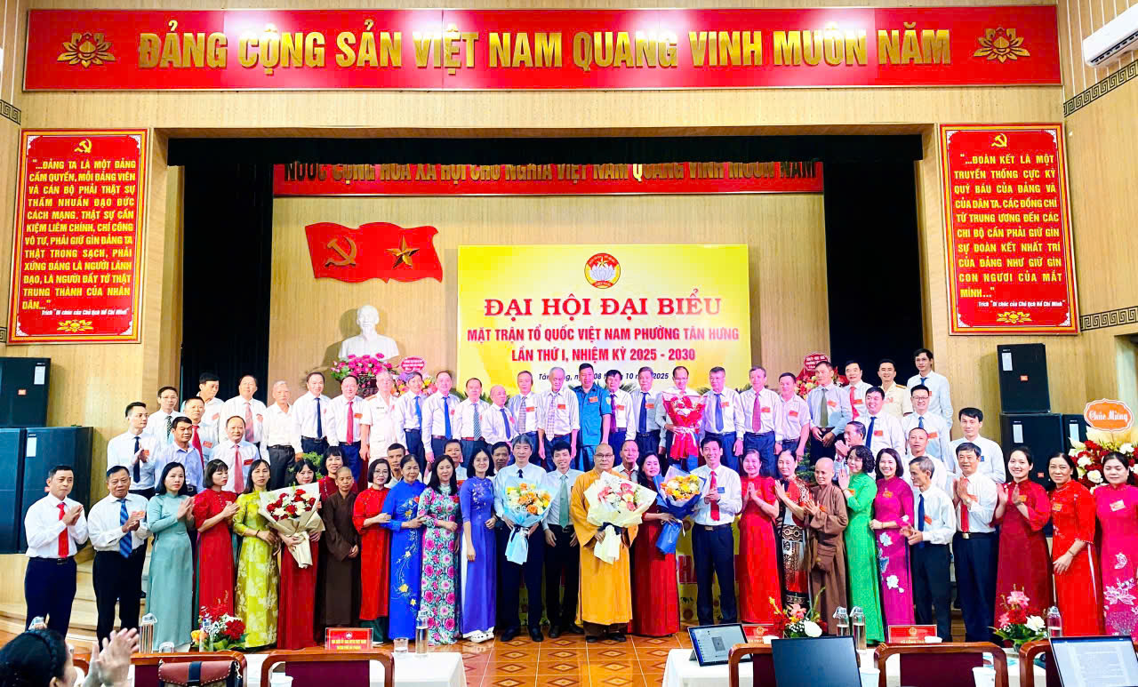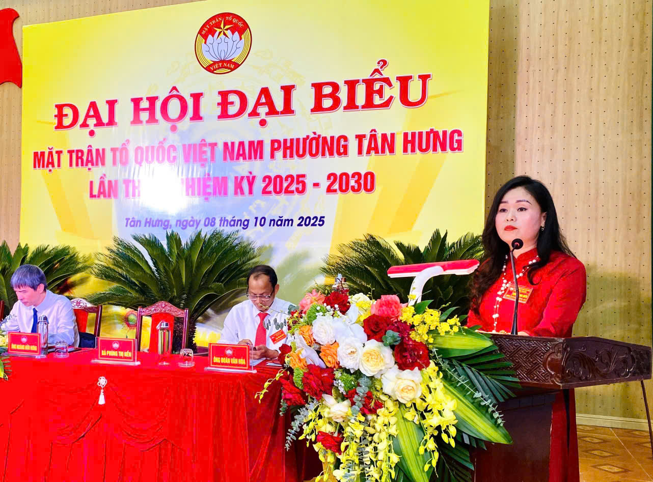 Chiều 8/10, Ủy ban Mặt trận Tổ quốc (MTTQ) Việt Nam phường Tân Hưng long trọng tổ chức Đại hội đại biểu MTTQ Việt Nam phường lần thứ nhất, nhiệm kỳ 2025 - 2030. Tham dự Đại hội về phía đại biểu thành phố có đồng chí Trương Thị Huyền - Chuyên viên Ban Dân chủ, giám sát và phản biện xã hội UBMTTQ Việt Nam thành phố. Về phía phường có sự hiện diện của các đồng chí: Nguyễn Trường Thắng - Bí thư Đảng uỷ, Chủ tịch HĐND; Hoàng Hữu Hưng - Phó Bí thư Thường trực; Vũ Công Thản - Phó Bí thư, Chủ tịch UBND cùng đại diện lãnh đạo các ban, ngành, đoàn thể và 114 đại biểu chính thức đại diện cho các cá nhân tiêu biểu trên địa bàn phường.