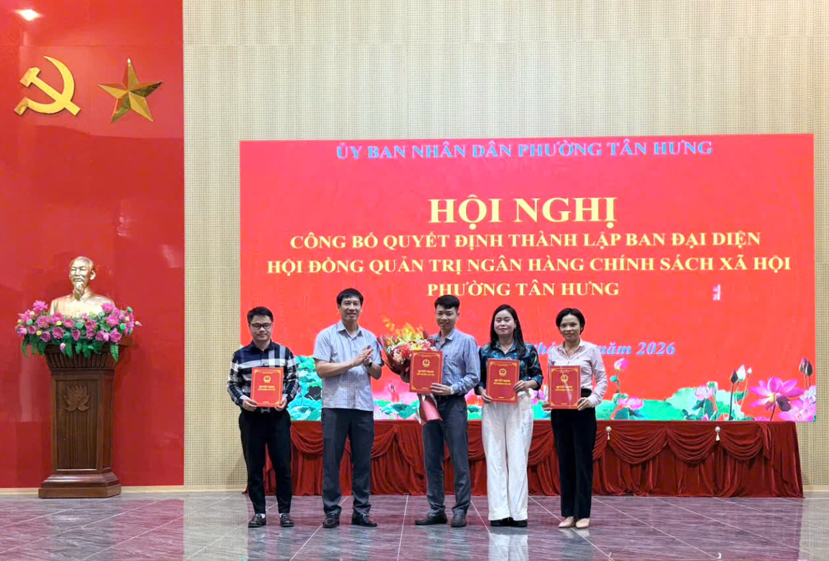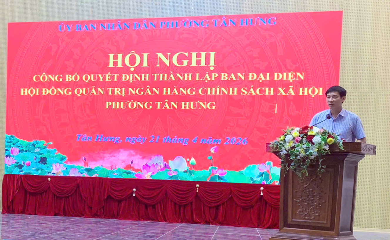 Chiều 21/4, Ủy ban Nhân dân phường Tân Hưng đã long trọng tổ chức Hội nghị công bố Quyết định thành lập Ban Đại diện Hội đồng Quản trị Ngân hàng Chính sách Xã hội phường Tân Hưng.
